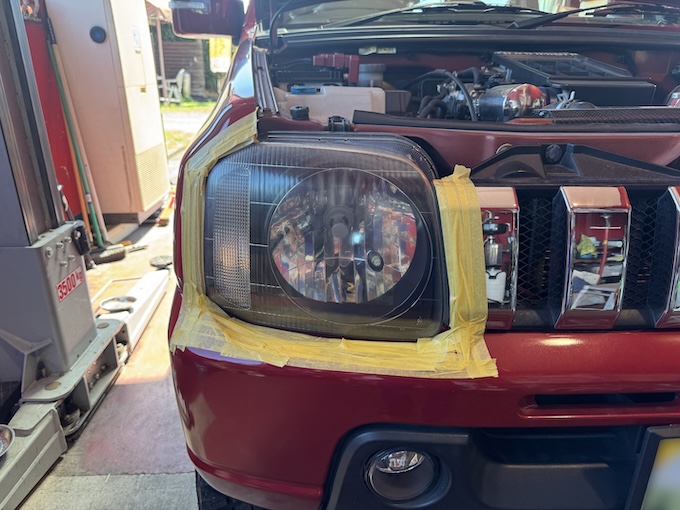 ヘッドライトを磨く際に、ボディに干渉しないようマスキングを行い研磨を行いました。
